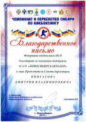 Благодарственное письмо Федерации кикбоксинга НСО, 2016 г.