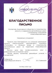 Благодарственное письмо Губернатора Новосибирской области, 2022 г.