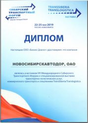 Диплом Международного Сибирского Траспортного форума, 2019 г.